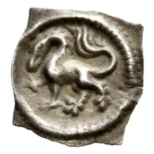 | Obverse description | Lion with swan neck and head, walking left inside toothed circle. |