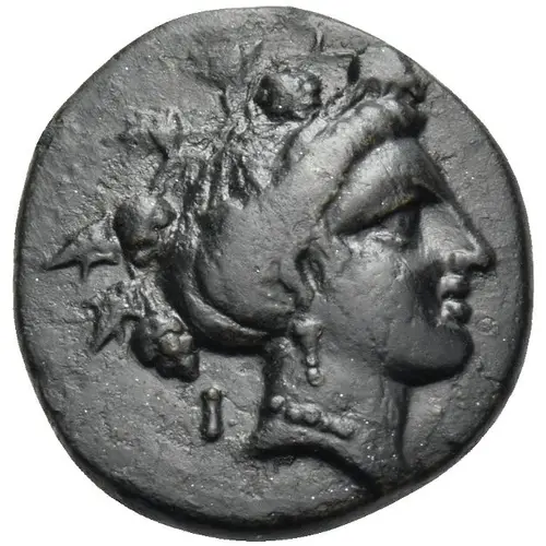 | Obverse description | Wreathed head of the nymph Histiaia to right; behind neck, I. |