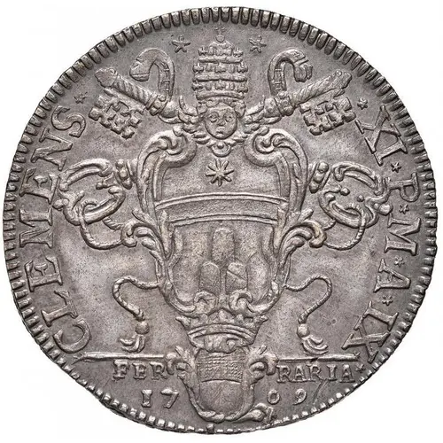 | Obverse description | Albani family coat of arms, topped by Papal keys and tiara, a cherub`s face at base of the tiara. In exergue, city arms of Ferrara divides FER RARIA and date |