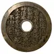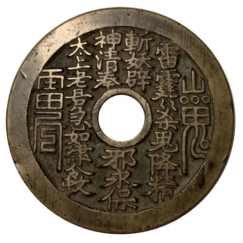 There are two distinct inscriptions on this side of the coin: one in traditional Chinese characters (in the center) and the other in Taoist magical characters (at the ends) |