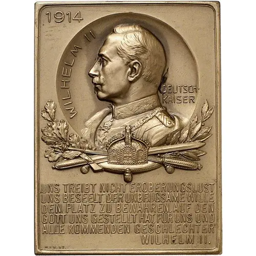 | Obverse lettering | 1914 WILHELM DEUTSCH- KAISER UNS TREIBT NICHT EROBERUNGSLUST UNS BESEELT DER UNBEUGSAME WILLE, DEN PLATZ ZU BEWAHREN, AUF DEN GOTT UNS GESTELLT HAT, FÜR UNS UND ALLE KOMMENDEN GESCHLECHTE WILHELM II. M. & W. ST. |