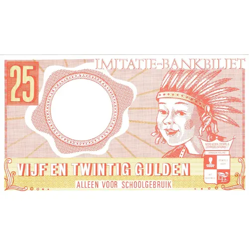 | Legenda awersu | 25 IMITATIE-BANKBILJET VIJF EN TWINTIG GULDEN ALLEEN VOOR SCHOOLGEBRUIK (Translation: 25 IMITATION BANKNOTE TWENTY FIVE GUILDERS FOR SCHOOL USE ONLY) |