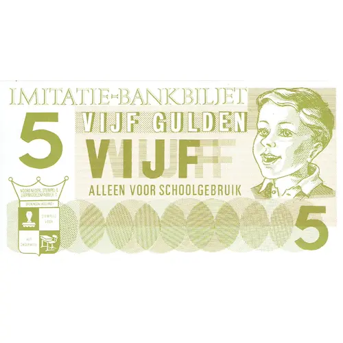 | Obverse lettering | IMITATIE-BANKBILJET 5 VIJF GULDEN VIJF ALLEEN VOOR SCHOOLGEBRUIK 5 (Translation: IMITATION BANKNOTE 5 FIVE GUILDERS FIVE FOR SCHOOL USE ONLY 5) |