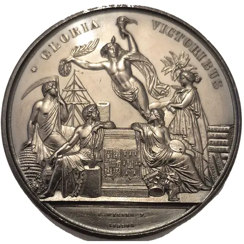 | Obverse description | (fr) 3 personnages assis sur de divers objets (corne d'abondance, amphore, engrenage, enclume, buste, chapeau de pilier) autour d'un coffre avec 2 écussons, 1 femme debout regardant un personnage volant tenant dans ses main un flambeau et une couronne de laurier, pile de livre à droite, mats d'un bateau en arrière plan à gauche |