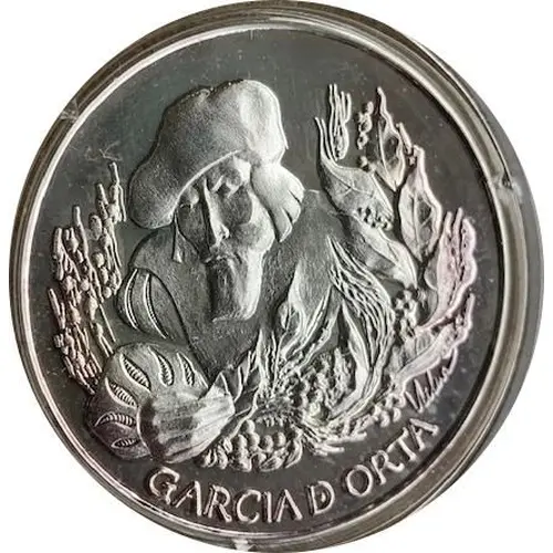 Bust of botanist Garcia da Orta leaning left and holding with right hand exotic plants from newly discovered lands spreading right across the coin. |