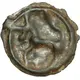 Reverse description Horse (or ibex) with bifid tail walking to the left; between its paws, a rosette composed of five globules.