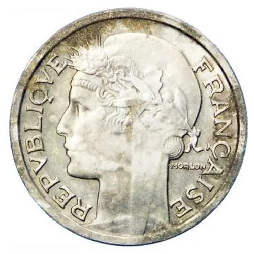 Draped bust of the Republic with short hair on the left, wearing a Phrygian cap adorned with a tricolor cockade (guilloche center, smooth circle, guilloche circle), under a composite wreath of wheat, oak and olive tree tied by a ribbon; under the ribbon MORLON. |