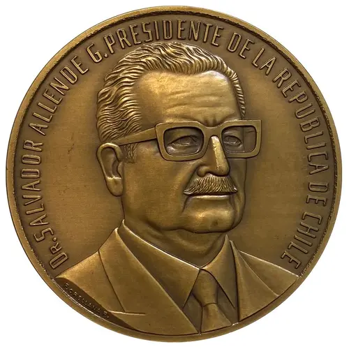 | Obverse lettering | Dr. SALVADOR ALLENDE G. PRESIDENTE DE LA REPUBLICA DE CHILE F.ORELLANA P. (Firma del diseñador y grabador) (Translation: Dr. SALVADOR ALLENDE G. PRESIDENT OF THE REPUBLIC OF CHILE F.ORELLANA P. (Signature of the designer and engraver)) |