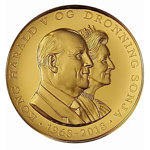 | Obverse lettering | KONG HARALD V OG DRONNING SONJA 1968-2018 (Translation: King Harald and Queen Sonja 1968-2018) |