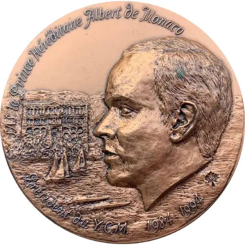 | Obverse lettering | S.A.S. le Prince Héréditaire Albert de Monaco Président du Y.C.M. 1884-1994 VG |
