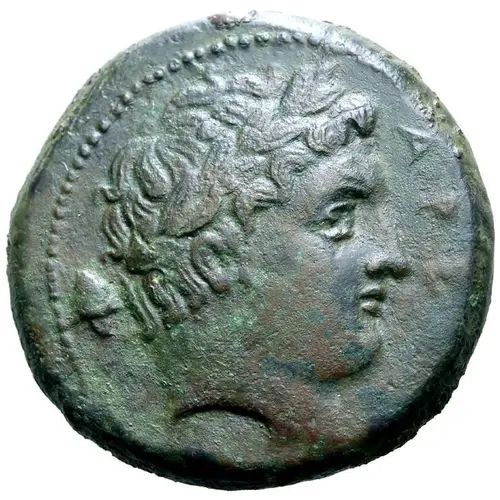 | 表面の説明 | Laureate head of Ares to right; APEOΣ before, symbol behind. |