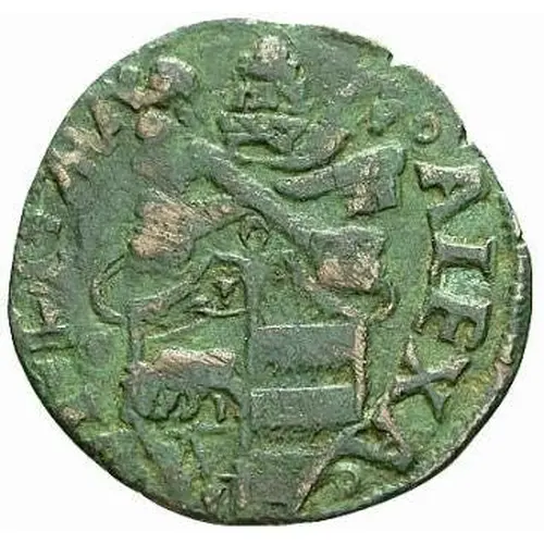 Technical/Grading: Given its nature as a small copper issue from the late 15th century, the Quattrino of Alexander VI often exhibits characteristics typical of manual production. High-points prone to wear include the intricate details of the bull's head on the Borgia arms, the contours of the papal tiara, and the teeth of the keys of St. Peter. Strike quality can be variable; off-center strikes, weak areas, and planchet irregularities (such as uneven thickness or irregular shape) are frequently observed. Well-centered examples with strong, complete strikes and clear legends are less common and thus highly prized by collectors, reflecting superior craftsmanship from the original minting process.