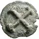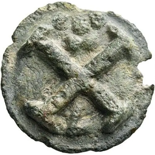 | Aversbeschreibung | Wheel of four spokes in an `X` pattern; in upper quarter, five pellets (mark of value); in bottom quarter, L; all on a slightly convex, circular, background. |