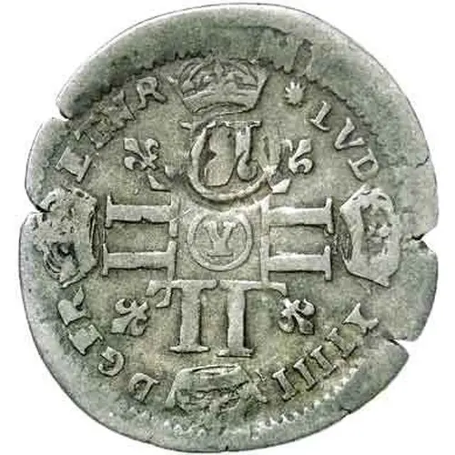 | Obverse description | Cross formed of eight L`s leaning against each other, each arm crowned, with different workshop in a circle in heart, flanked by four lilies diverging from the center. Currency having been overprinted on a quinzain of Louis XIII (nine or twelve countermarked). |