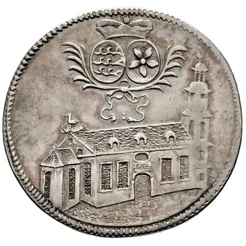 | Obverse description | Prince`s hat over the coats of arms of Württemberg and Eberstein on palm branches over a view of the church. |