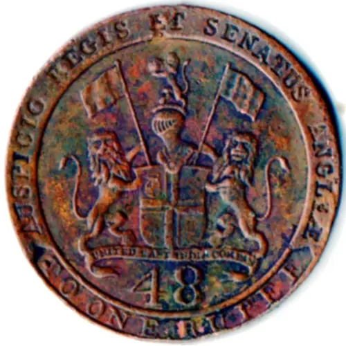 Arms and supporters of the East India Company. The design of the obverse is similar to the genuine coin of 1797 but different to the genuine coin of 1794 (different helmet) |