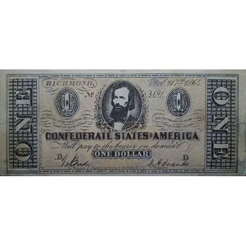 Obverse lettering THE CONFEDERATE STATES OF AMERICA - Will pay ONE DOLLAR to the bearer on demand - N° 3691 RICHMOND, Feb. 17th1864