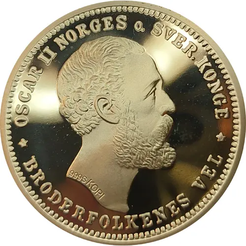 Obverse lettering OSCAR II NORGES o. SVER. KONGE 999S KOPI * BRODERFOLKENES VEL *