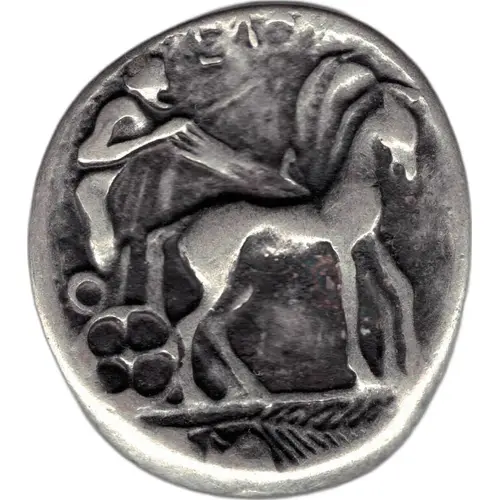 | Obverse description | Biga of horses at the walk to r., driven by a bearded male charioteer holding a kentron (whip) in his right hand and the reins in his left. In exergue pine branch with cone. |