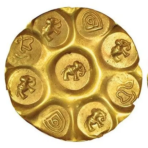 | Obverse description | Nine punches on flan with 5 Elephants standing facing right, Two `Shri` marks, 1 `Maraa` and 1 `Pathi`. |