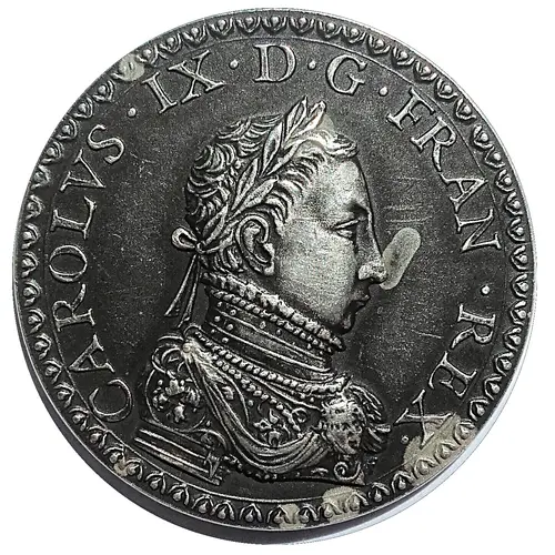 | Popis líce | Bust crowned with laurel and clad in armor, turned right, of Charles IX. |