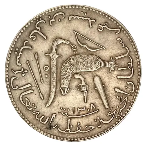 Circular Arabic legend, in the middle a dagger, a bow, a gun, a sword, an arrow and an assegai |
