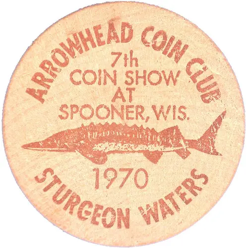 | Obverse lettering | ARROWHEAD COIN CLUB 7th COIN SHOW AT SPOONER, WIS 1970 STURGEON WATERS |