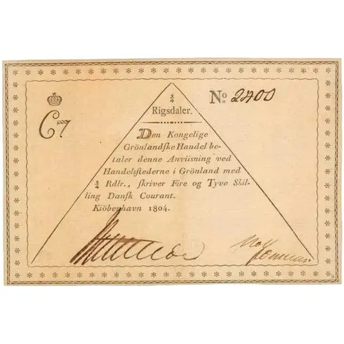 | Obverse lettering | 1/4 Rigsdaler. Den Kongelige Grönlandſke Handel be- taler denne Anviisning ved Handelsſtederne i Grönland med 1/4 Rdlr., ſkriver Fire og Tyve Skil ling Danſk Courant. Kiöbenhavn 1804. (Translation: 1/4 Rigsdaler. The Royal Greenlandic Trading will pay this note at the trading posts in Greenland with 1/4 Rigsdaler, written twentyfour Skilling Danish Courant. Copenhagen 1804) |