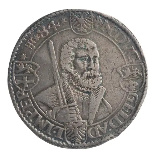| Obverse description | Harnessed buste of Emperor Rudolph II with upward sword in right hand. Mint mark on top. Four small shields of Nijmegen (top), Roermond (right), Arnhem (bottom) and Zutphen (left) dividing letterinh. |