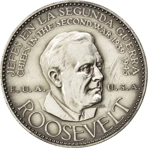 Franklin D. Roosevelt facing right, text in Spanish and English: name of the series above, person name below, country on sides |