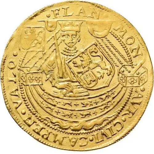 Ruler in ship facing, holding sword with right hand and shield with provincial arms in left hand; on stern, banner with lion to left. |