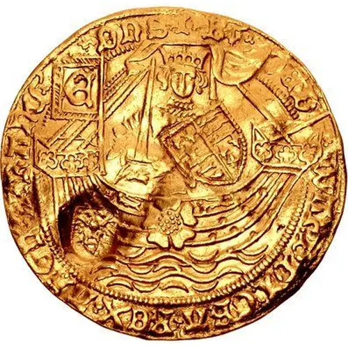 | Obverse description | King Edward IV standing facing, holding sword and shield, in ship with bowsprit, Є on banner on stern, rose on hull; countermarked eagle (Groningen arms) |