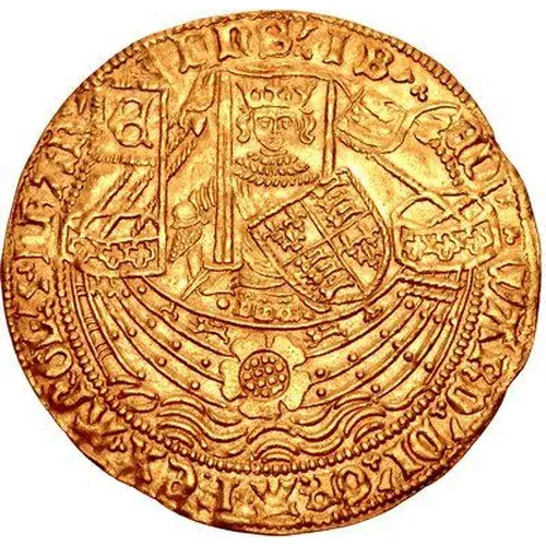 Ruler with sword and coat of arms standing on ship, flag with gothic `E` on hind stern |