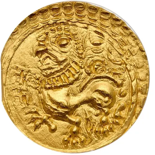 | Obverse description | Royal Lion, paw up and tail turled, with symbols - Sun, Moon, Swastika, and year. |