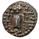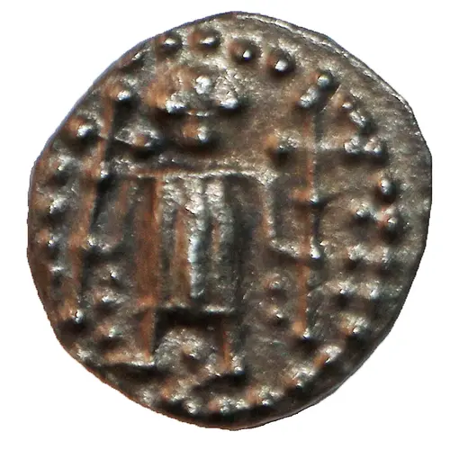 Obverse description Figure facing, wearing long tunic, long cross pommée at either side, pellets on shaft of crosses and in field.