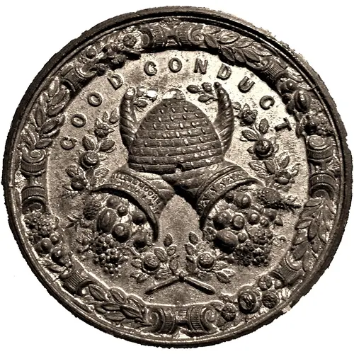 Under a beehive, two cornucopias pouring fruit into a wreath of roses. The names of the engravers inscribed in the edge of the left horn. The legend above the cornucopias with a wreath braided with flowers and bay leaves on the border. |