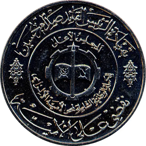 الجمهورية العراقية بسم الله الرحمن الرحيم ١٤٠٠ هـ ١٩٧٩ مـ ١ ١٢ يوم العلم (Translation: Republic of Iraq In the name of God, the Most Gracious, the Most Merciful 1400 AH 1979 AD 1 12 Science Day) |
