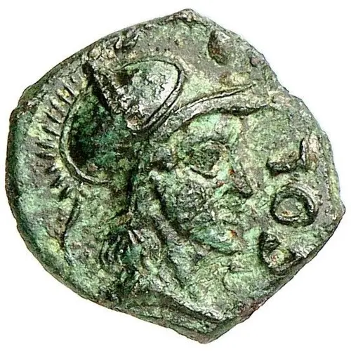 Helmeted head right.