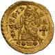 Pearl-diademed, draped and cuirassed bust of Leo I right, seen from front.