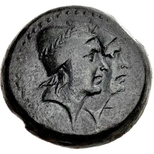 | Obverse description | Jugate heads of the Dioskouroi right, each wearing conical cap decorated with a laurel wreath. |