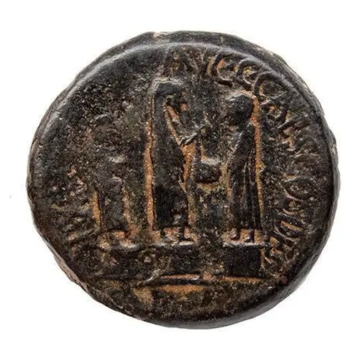 | Popis líce | Three standing figures: Augustus in middle holding simpulum, Lucius Caesar and Gaius Caesar beside, all on bases. |