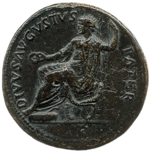| Descripción del anverso | Divus Augustus, radiate, seated left on curule chair, feet on stool, holding patera in right hand and long vertical sceptre in left: altar to left. |