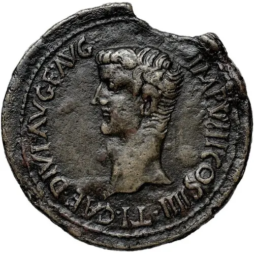 TI CAE DIVI AVG F AVG IMP VIII COS IIII (Translation: Tiberius Caesar, son of the divine Augustus, Augustus, imperator for the eighth time, consul for the fourth time) |