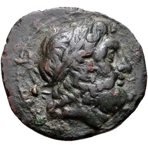 Ön yüz açıklaması Laureate head of Zeus to right; behind, two stars.