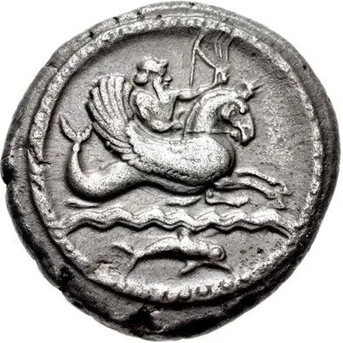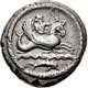 | Aversbeschreibung | Melkart, holding bow in extended left hand and reins in right, riding hippocamp right; below, waves above dolphin right. |