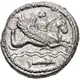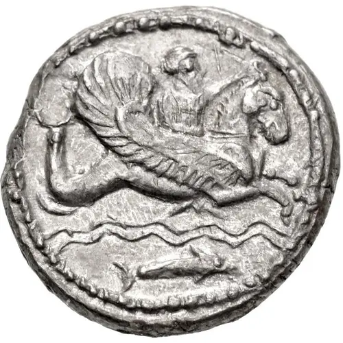 | Description de l’avers | Deity holding reins and arched bow, riding hippocamp right above two lines of waves, dolphin right below. |