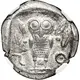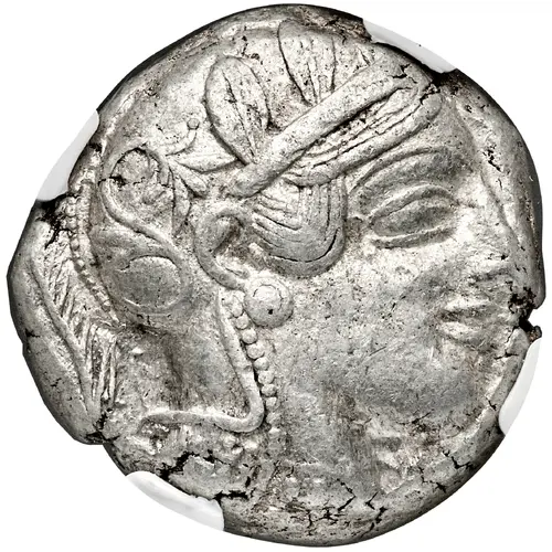 | Obverse description | Head of Athena right, with frontal eye, wearing earring, necklace with pendants, and crested Attic helmet decorated with three olive leaves over visor, spiral palmette on bowl |