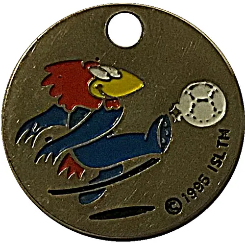 | Obverse description | Mascot (blue, yellow, red) of the French soccer team 1998 shooting a ball (white) Hole on top |