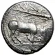| 正面描述 | Bull kneeling to right on ground line; bare fir-tree trunk above |