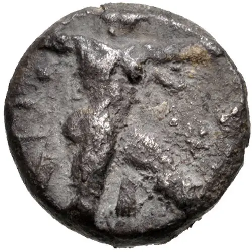 | Description de l’avers | Bearded Heracles wearing a lion`s hide on his shoulder, walking towards right. He is holding a bow with outstreched left hand and holding a club above his head with his right hand. Ankh symbol on his right. Beaded ring on the rim. |